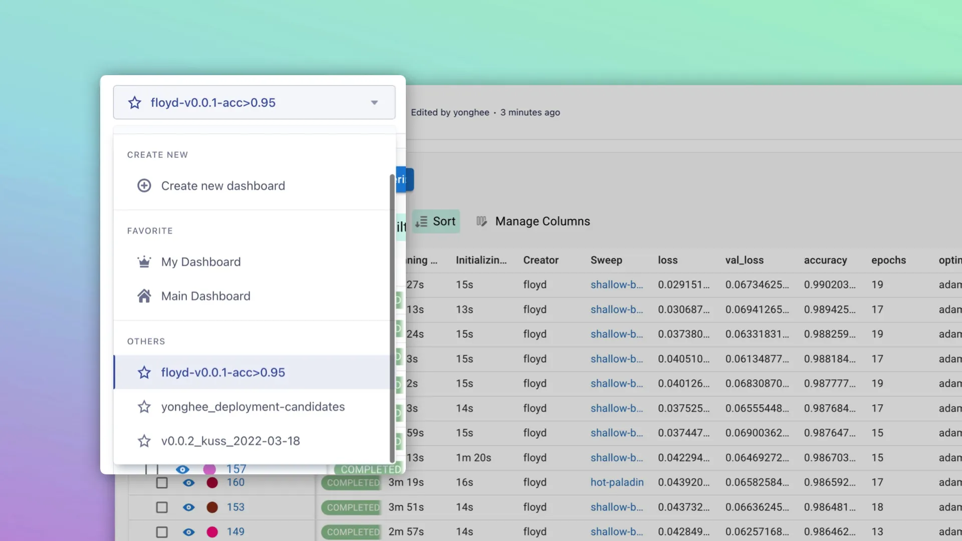 You can now create multiple views of experiment tracking dashboard. This means you can apply filters and sorts to your team’s shared dashboard views without disrupting anyone else, and create multiple dashboards based on these changes.