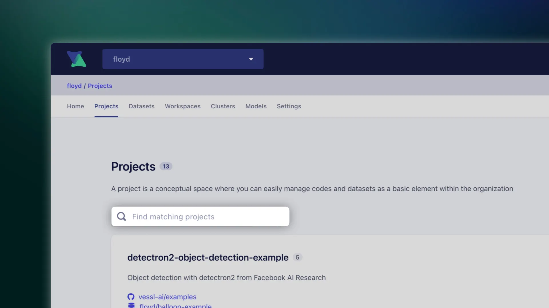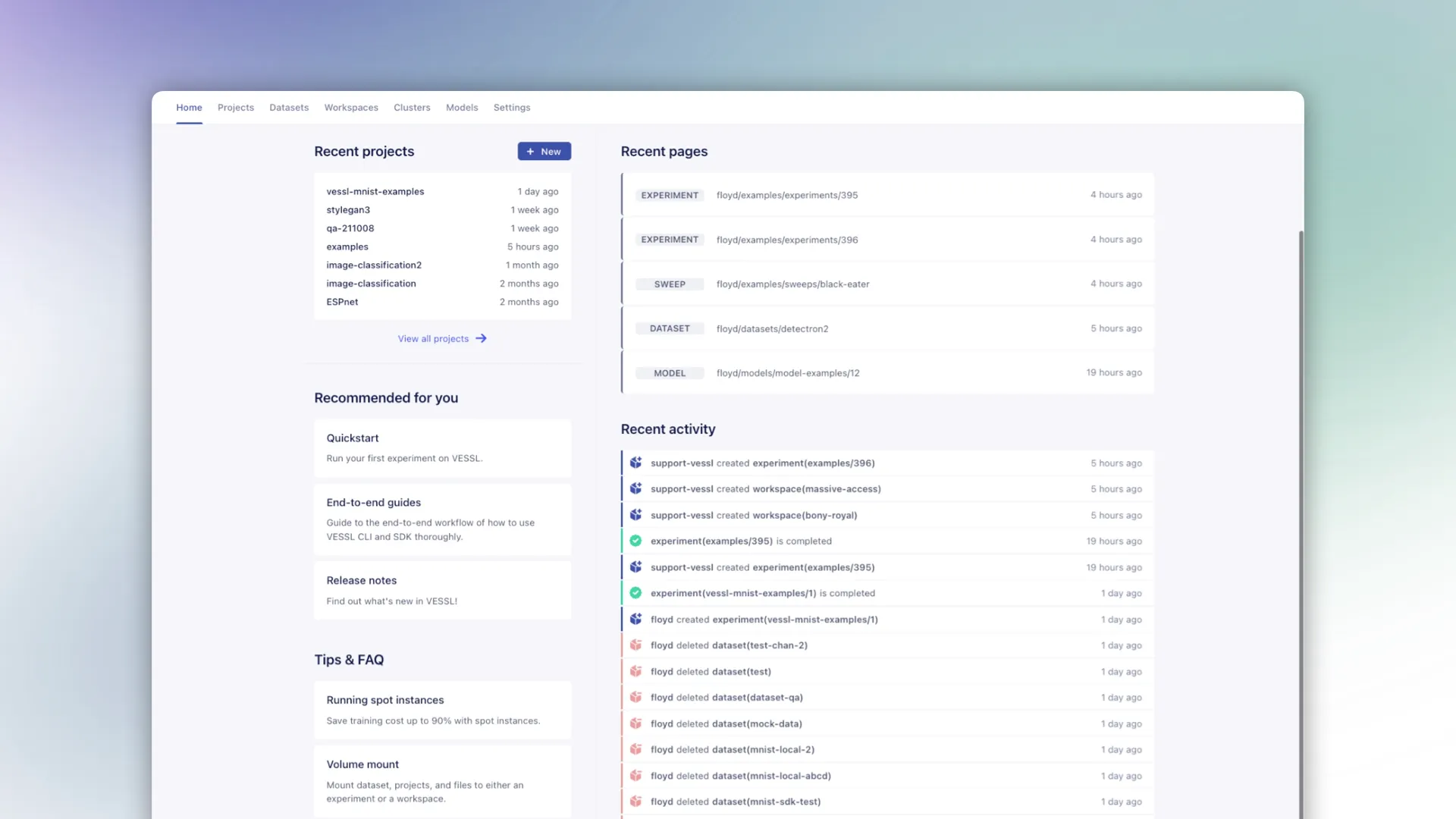 Home is an overview page for your ongoing projects and activities in you organization. Here, you can find your team’s recent activity and tips and tricks to use VESSL. We hope this brings more visibility to your team.