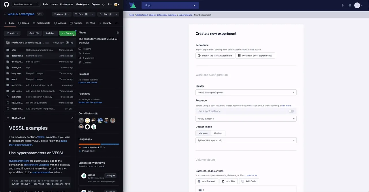 You can now connect public GitHub, GitLab, and Bitbucket repositories to VESSL. This is as simple as copying & pasting the .git URL of the repository into your experiment launch page. Try out yourself with our public GitHub repo containing some example codes: